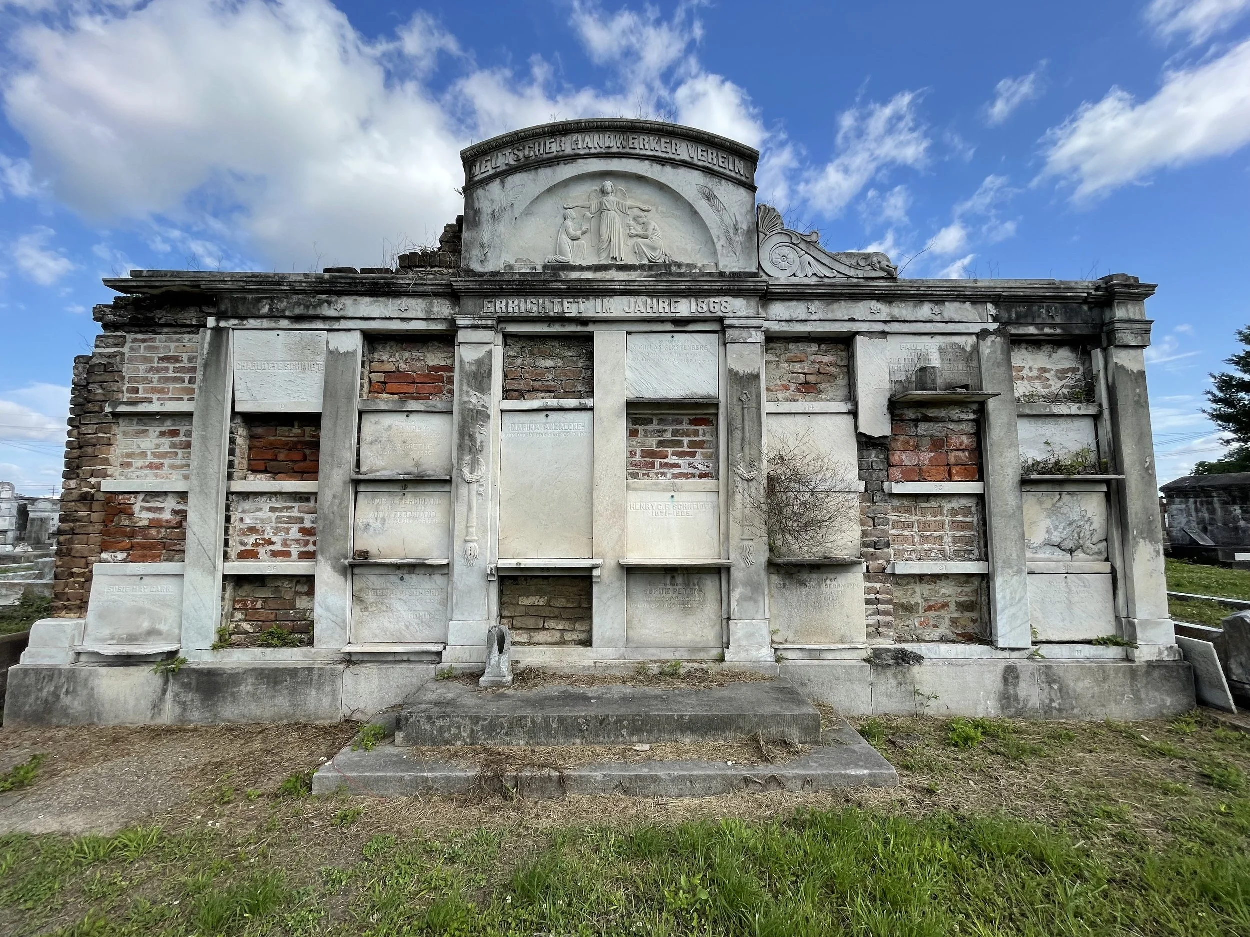 What are Benevolent Societies you ask? Simply put, they were associations formed in the 19th century that were typically organized by religion, nationality, or trade. With few exceptions, most were segregated by race. Members paid dues and, in turn, were provided with a dignified final resting place for their remains. By 1888, it was reported that about 80% of all New Orleanians belonged to a benevolent society of some kind. It wasn’t all serious though; many societies held balls, banquets, parades, and often celebrated the completion of their tomb with a procession and brass band. In the 20th century when life insurance and health insurance became more commonplace, benevolent associations fell out of favor.