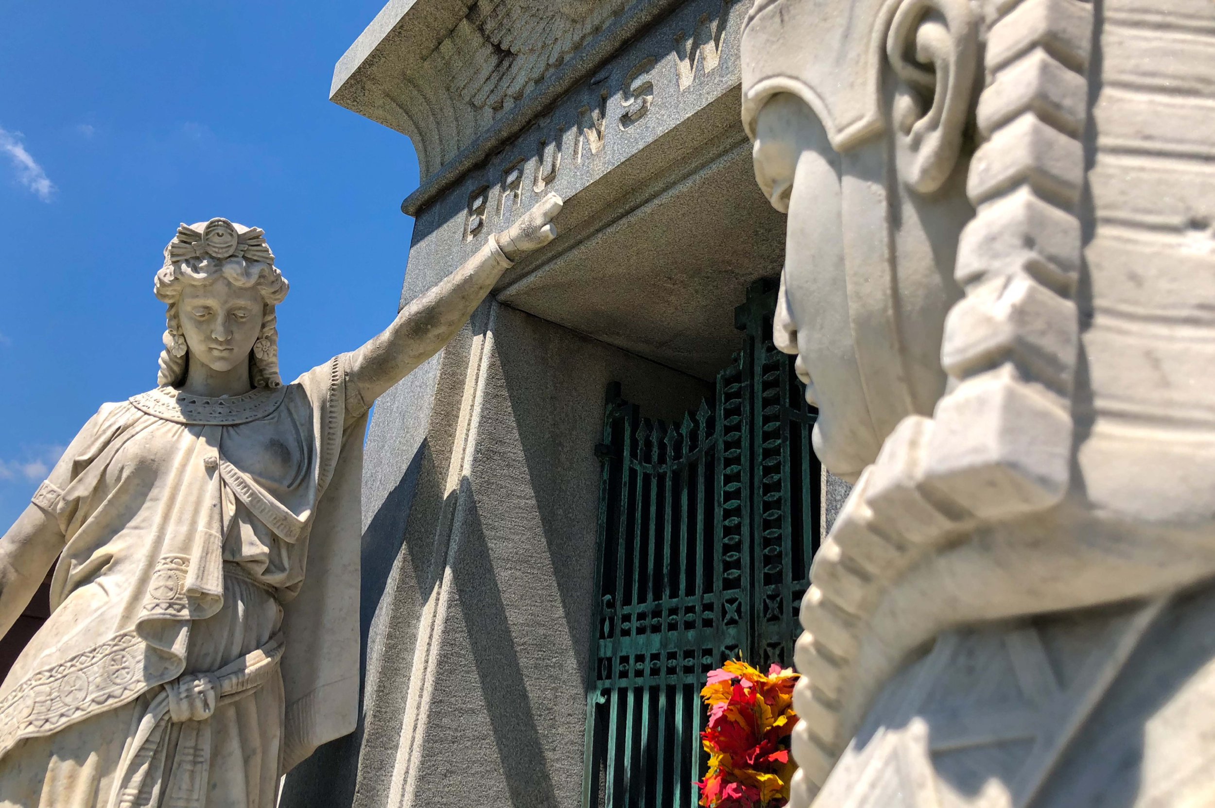 On “Millionaire’s Circle” you will see and learn about the pyramid guarded by a serious-looking sphinx and a woman wearing an all-seeing eye headdress; the tallest tomb in the cemetery; a medieval revival-style tomb with “jewel” stained-glass windows that illuminate the vaulted chamber, with marble female mourners positioned outside; and the Islamic-inspired tomb made of limestone that a Confederate general built for his daughter.