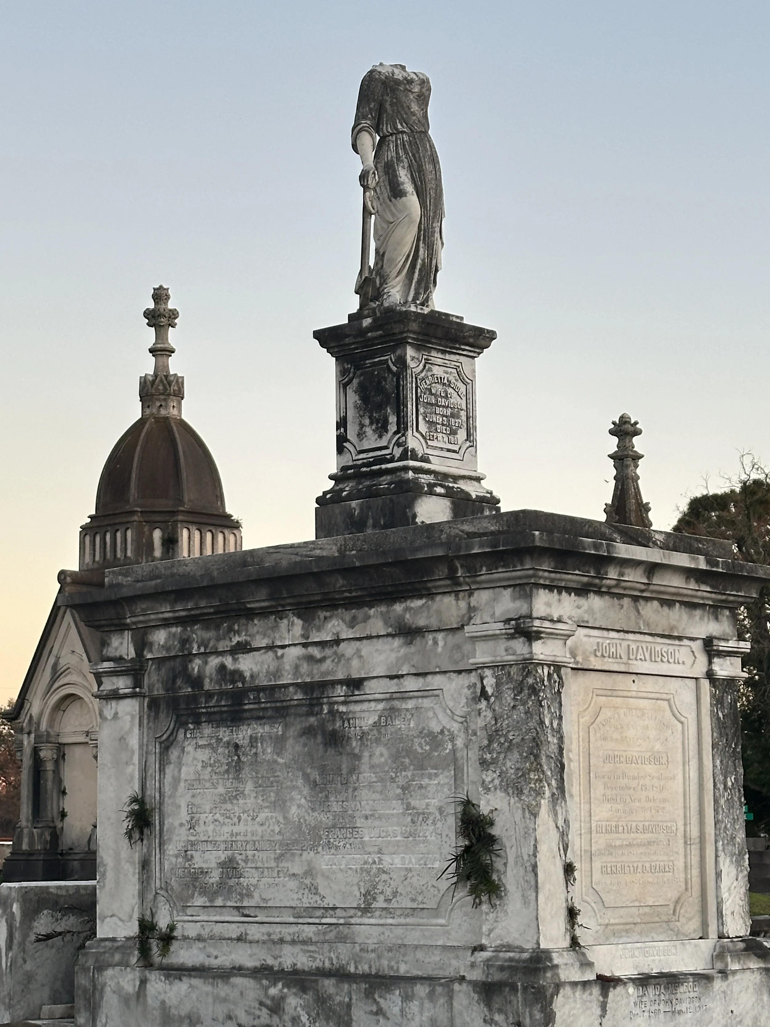 On “Millionaire’s Circle” you will see and learn about the pyramid guarded by a serious-looking sphinx and a woman wearing an all-seeing eye headdress; the tallest tomb in the cemetery; a medieval revival-style tomb with “jewel” stained-glass windows that illuminate the vaulted chamber, with marble female mourners positioned outside; and the Islamic-inspired tomb made of limestone that a Confederate general built for his daughter.
